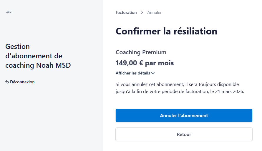 Si tu choisis d’annuler, ton abonnement reste actif jusqu’à la fin de la période déjà payée.