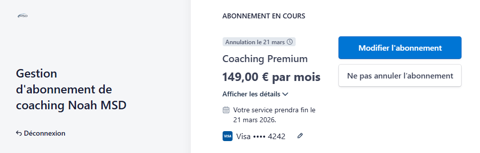 Clique sur “Modifier l’abonnement” pour changer d’offre ou sur “Annuler l’abonnement” pour stopper le renouvellement.