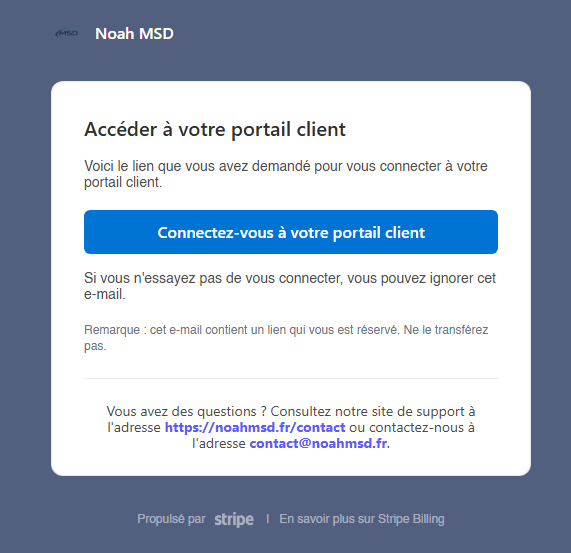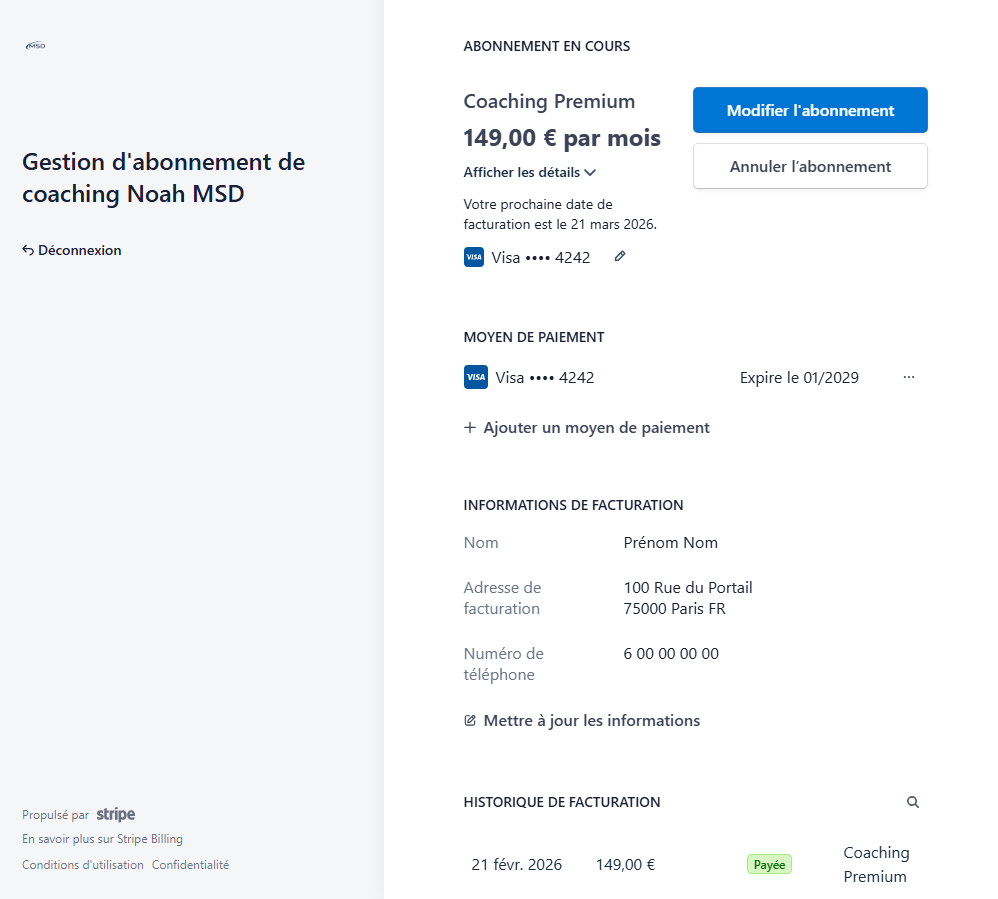 Le portail client est hébergé par Stripe, la plateforme utilisée pour le paiement de ton abonnement.